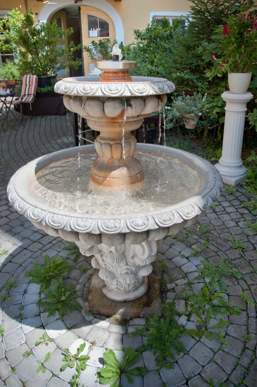 Das Zentrum des Innenhofs bildet ein Springbrunnen, der wesentlich zum Flair des Gastgartens beiträgt. Die ausgestrahlte Ruhe und die vom Wasser ausgehende Kühle lassen Sie den Stress des Alltags vergessen. Kühle Drinks und erfrischende Cocktails lassen den Tag perfekt ausklingen.